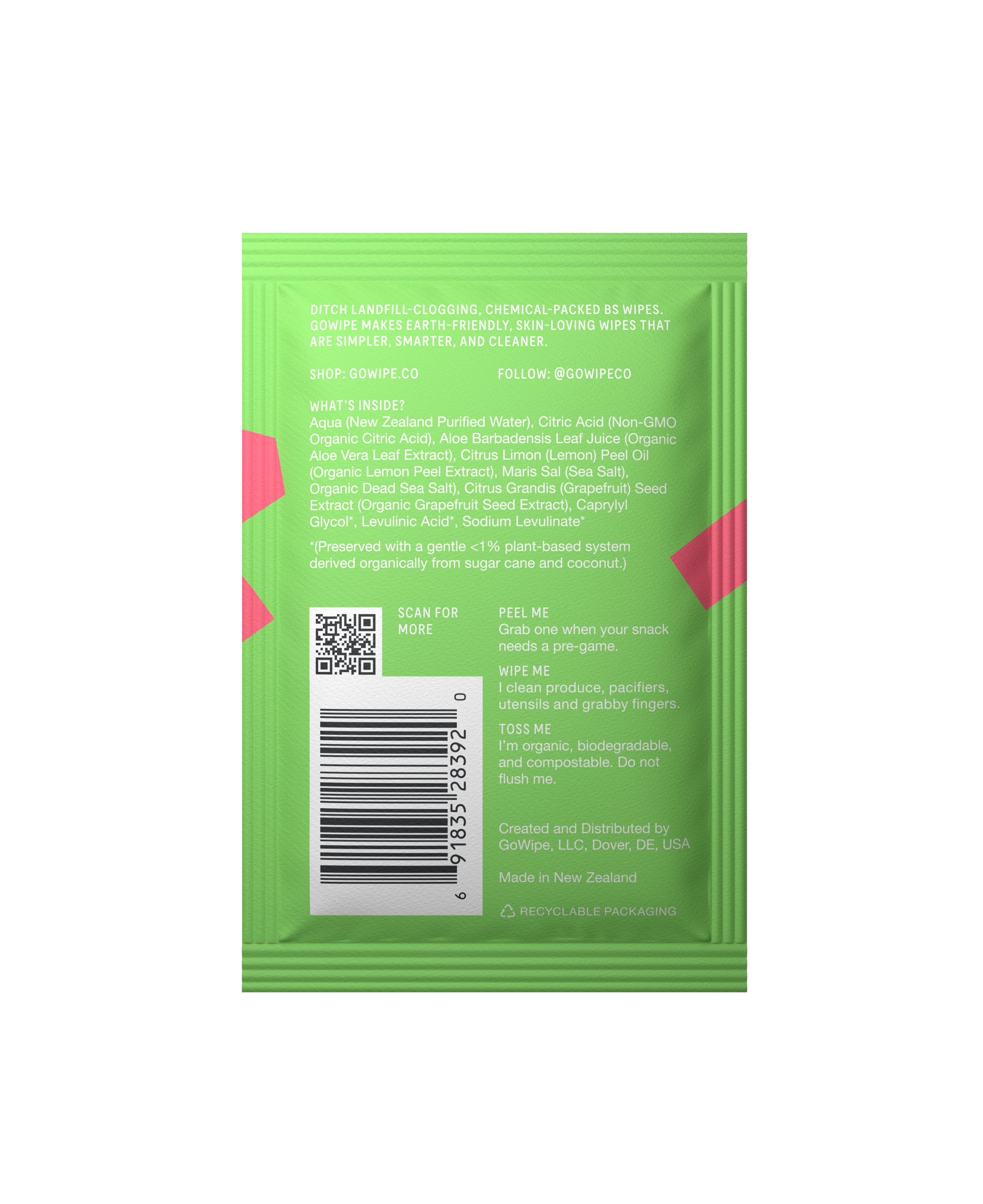 Organic & Food Safe Wipes. These GoWipes are made to be used for fruit, vegetables, hands & anything else that needs a quick wipe. No water, soaking, or scrubbing brush required.